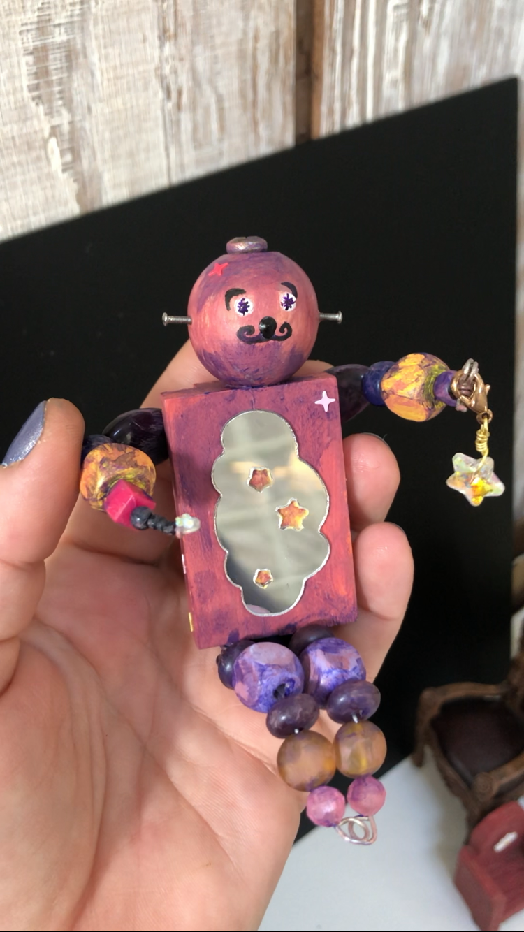 Meet Orion, a handmade mixed media miniature robot with a secret: he knows the constellations like the back of his hand (or, well, his metallic claw). Clutching a lucky star and stardust, he retreats to his high-backed chair each night, lost in the celestial tapestry above.