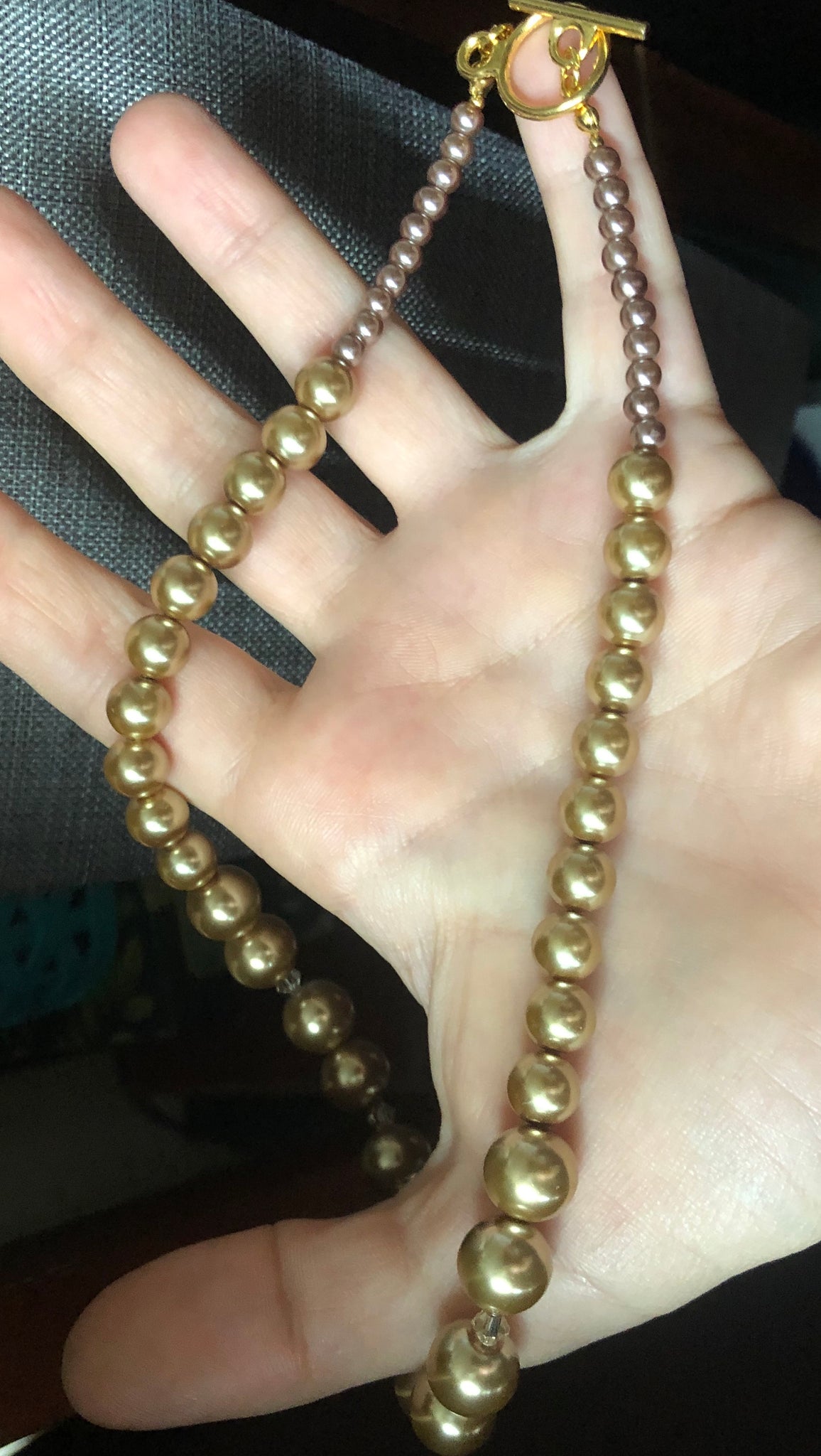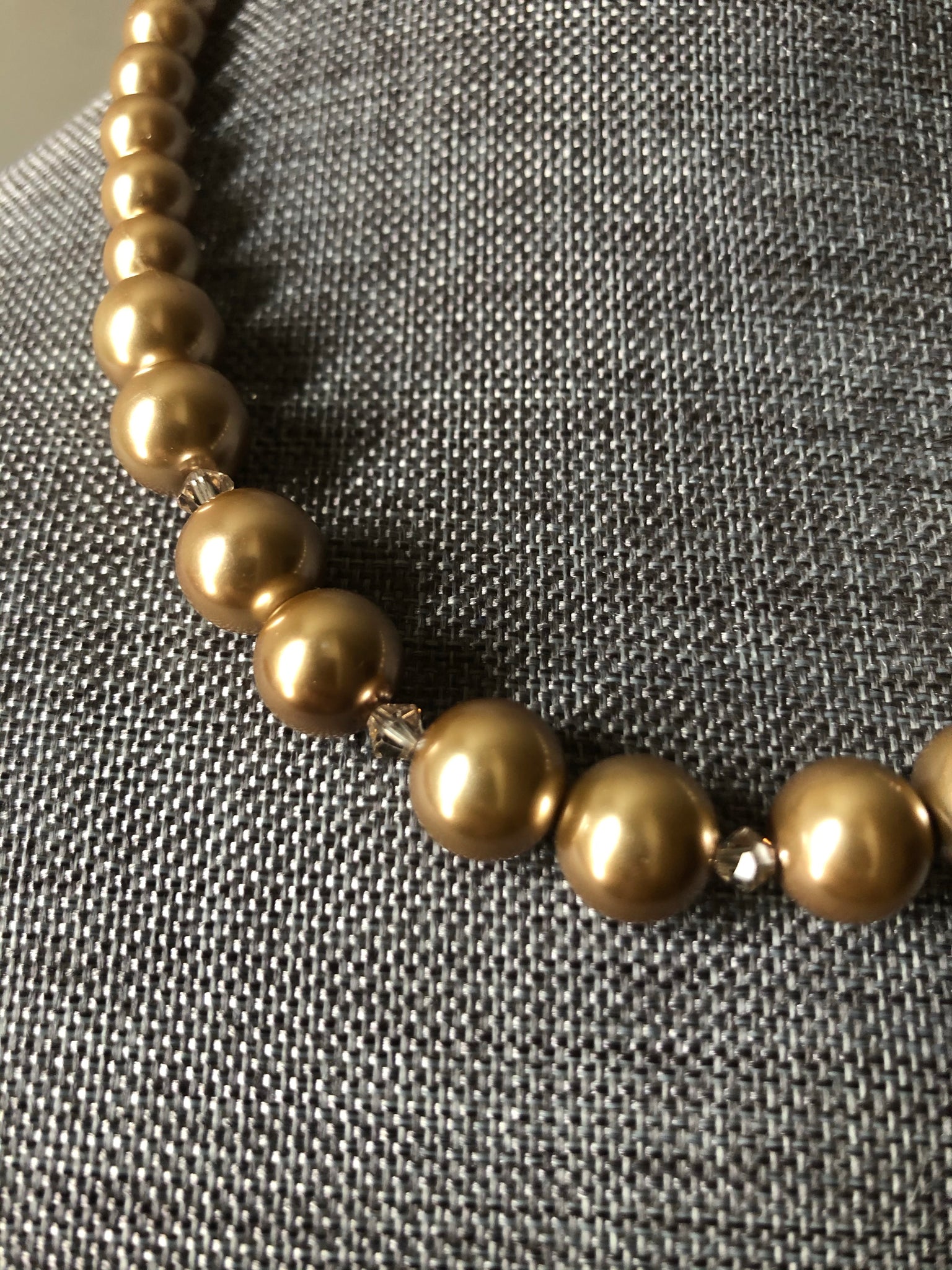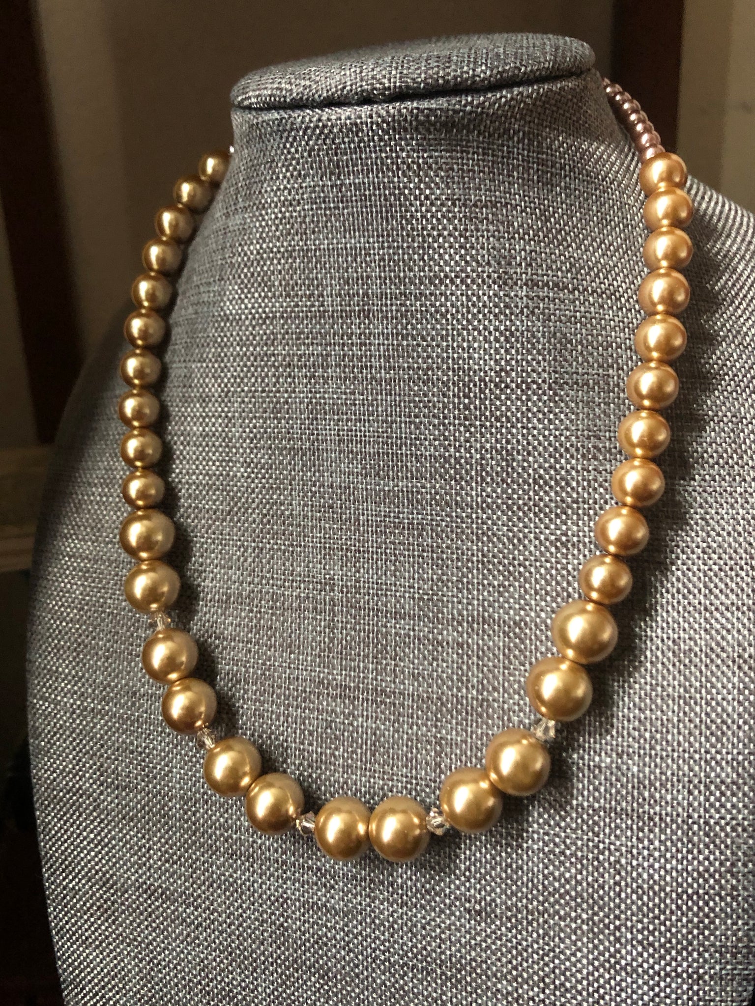 Choker/collar style necklace made of beautiful glass pearl beads and crystals. Closure is gold tone toggle clasp.