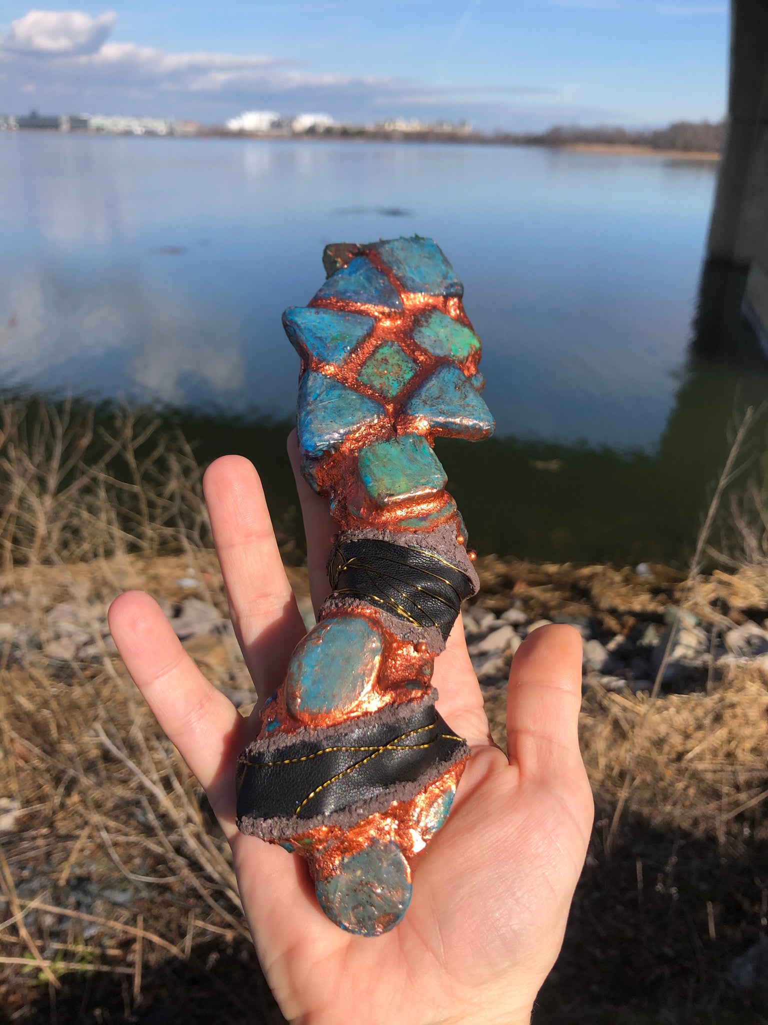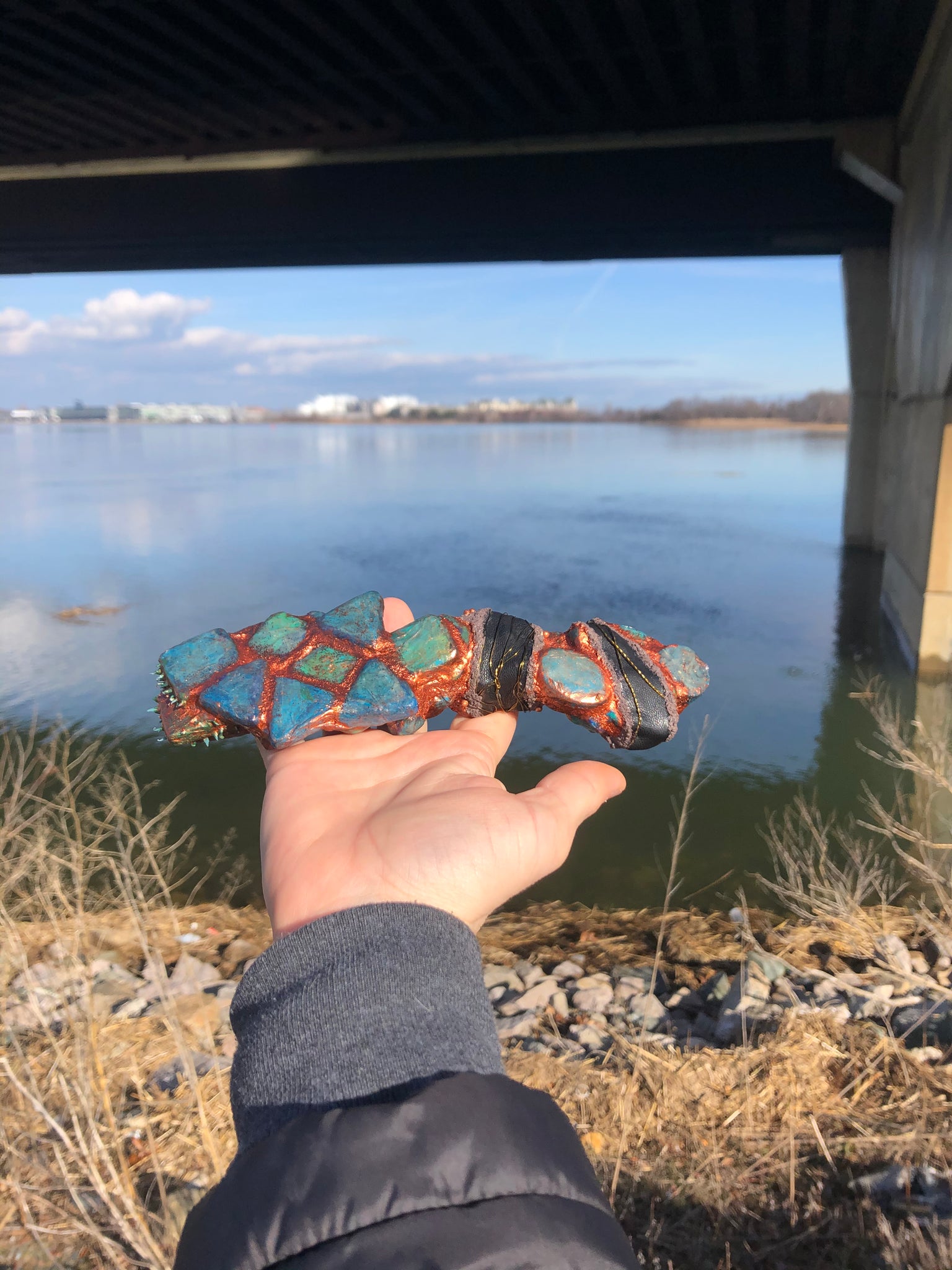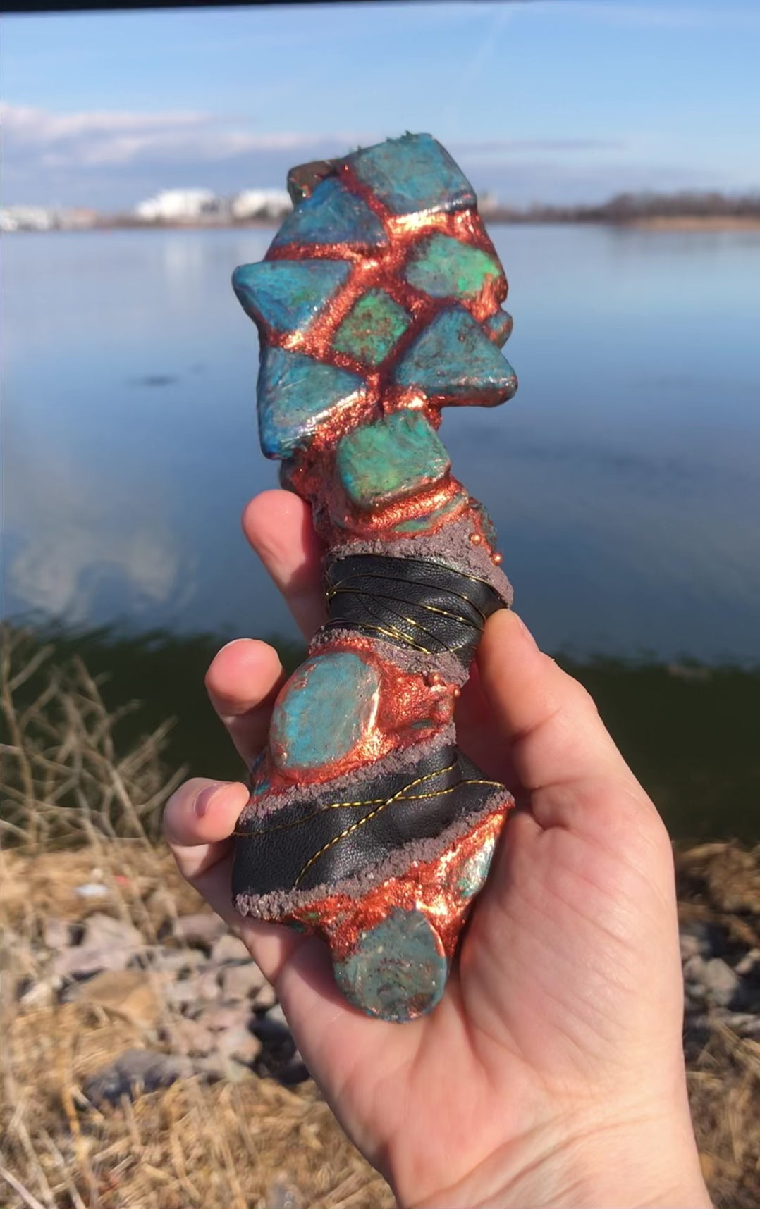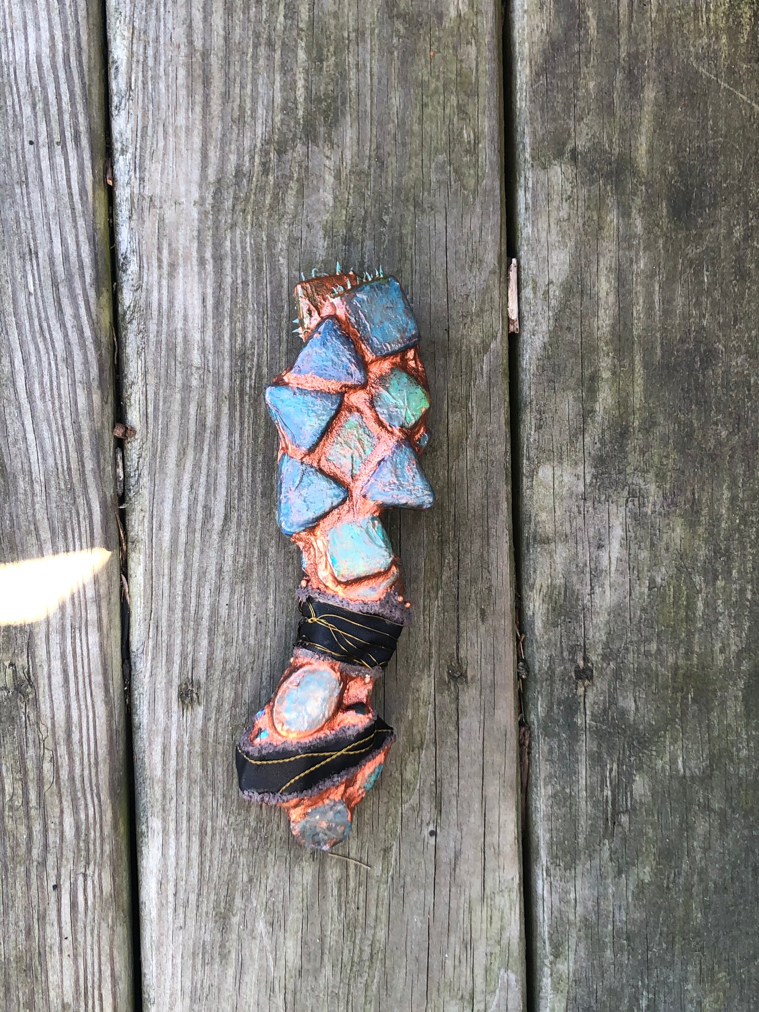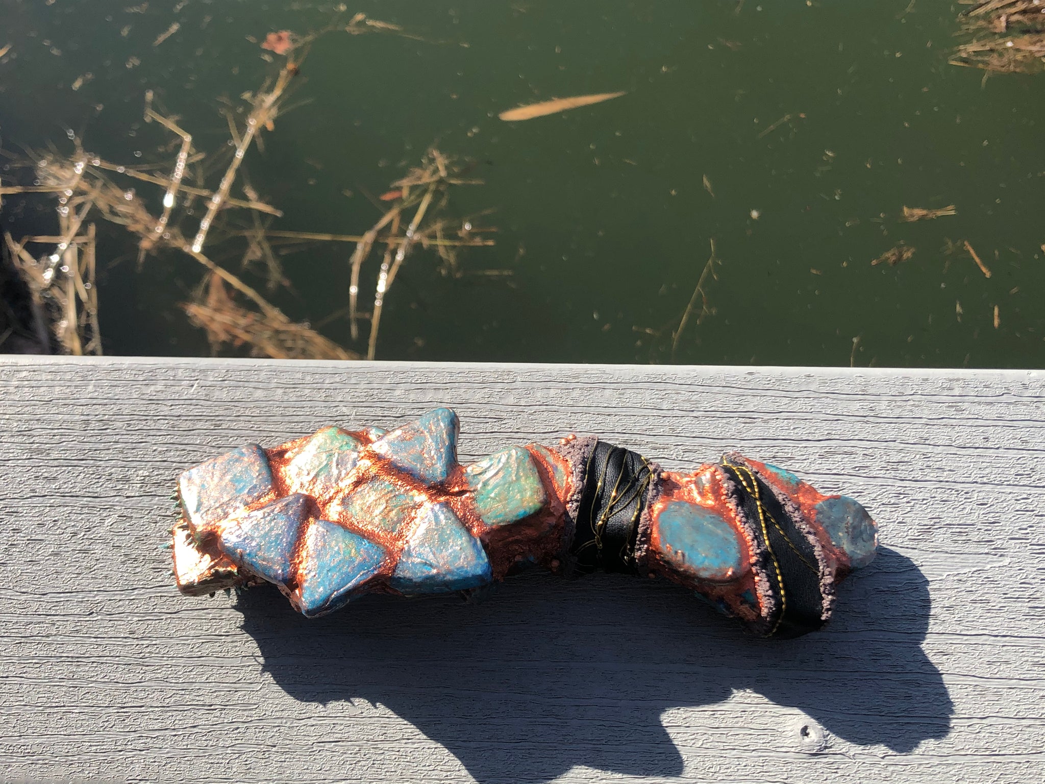 A unique mixed media sculpture, up-cycled and repurposed materials were used to create this stony structure. Blues and greens dominate the palate and a skin like texture covers the length. Silicone was used to make snake-like fangs that protrude from the tip. The grip is a combination of faux leather, copper wire and cement.
