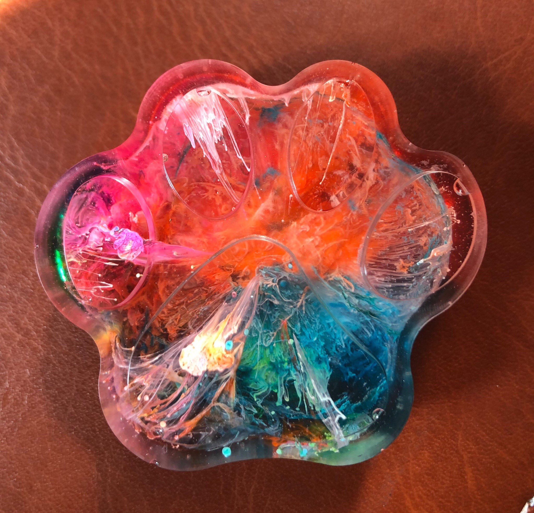Paw made of epoxy resin and accented with bursts of colors. These little beauties are wonderful as is or you have the option of adding hardware and or embeds. Please choose your hardware options from keychain, ornament, or necklace.